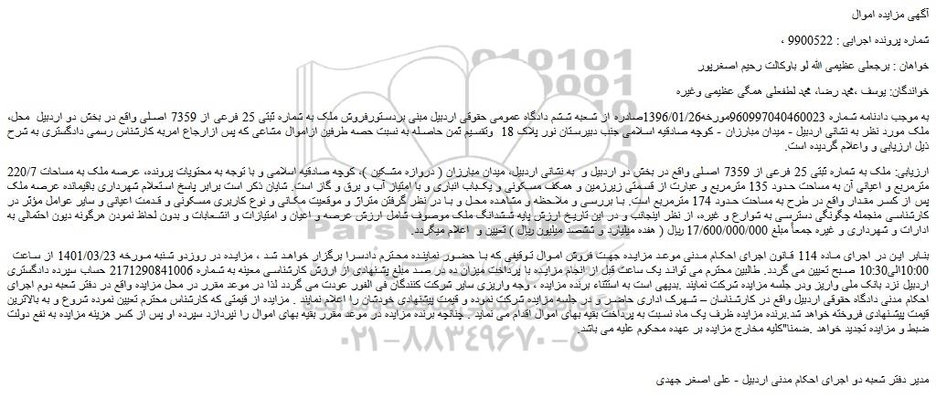 ،به موجب دادنامه شماره 960997040460023مورخه1396/01/26صادره از شعبه ششم دادگاه عمومی حقوقی اردبیل مبنی بردستورفروش ملک به شماره ثبتی 25 فرعی از 7359 اصلی واقع در بخش دو اردبیل  محل ملک مورد نظر به نشانی اردبیل - میدان مبارزان - کوچه صادقیه اسلامی جنب دبیرستان نور پلاک 18  وتقسیم ثمن حاصله به نسبت حصه طرفین ازاموال مشاعی که پس ازارجاع امربه کارشناس رسمی دادگستری به شرح ذیل ارزیابی و واعلام گردیده است.