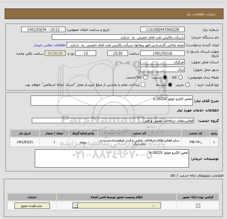 شرح کلی نیاز: تعمیر الکترو موتور p-2622c