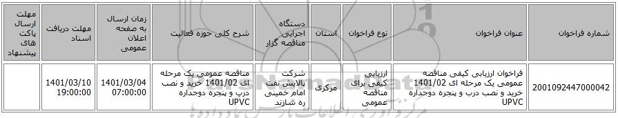 مناقصه، فراخوان ارزیابی کیفی مناقصه عمومی یک مرحله ای 1401/02 خرید و نصب درب و پنجره دوجداره UPVC, فراخوان ارزیابی کیفی مناقصه عمومی یک مرحله ای 1401/02 خرید و نصب درب و پنجره دوجداره UPVC
