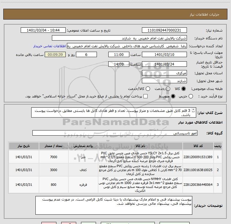 شرح کلی نیاز: 3 قلم کابل طبق مشخصات و متراژ پیوست. تعداد و قطر هادی کابل ها بایستی مطابق درخواست پیوست باشد. مقدار مورد نیاز به متر می باشد.
