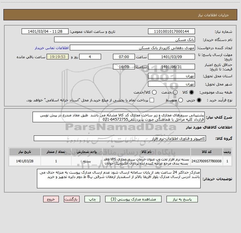 شرح کلی نیاز: پشتیبانی سرورهای مجازی و زیر ساخت مجازی کد کالا مشابه می باشد طبق مفاد مندرج در پیش نویس قرارداد کلیه مراحل با هماهنگی صورت پذیرد.تلفن64572755-021