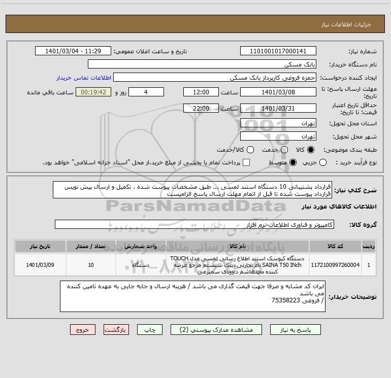 شرح کلی نیاز: قرارداد پشتیبانی 10 دستگاه استند لمسی ... طبق مشخصات پیوست شده ، تکمیل و ارسال پیش نویس قرارداد پیوست شده تا قبل از اتمام مهلت ارسال پاسخ الزامیست