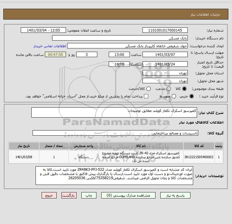 شرح کلی نیاز: کمپرسور اسکرال تکفاز کوپلند مطابق توضیحات