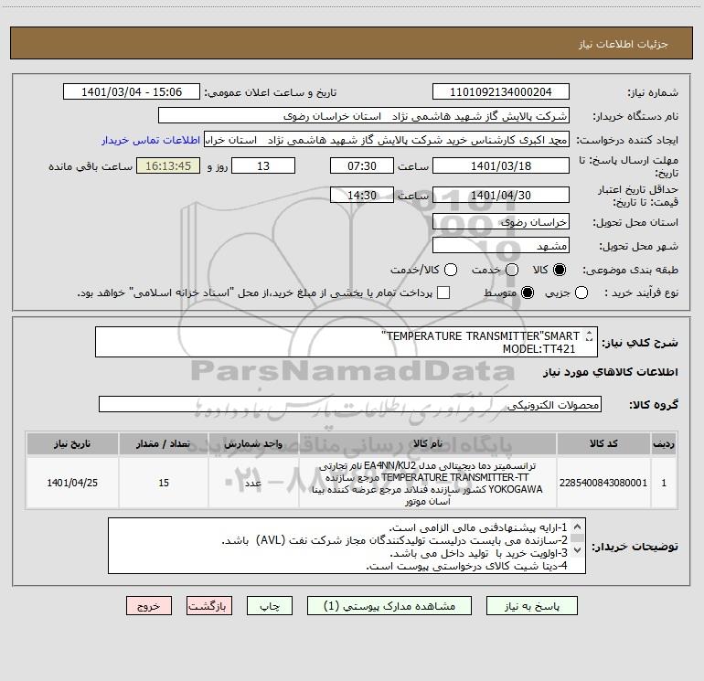 شرح کلی نیاز: TEMPERATURE TRANSMITTER"SMART"