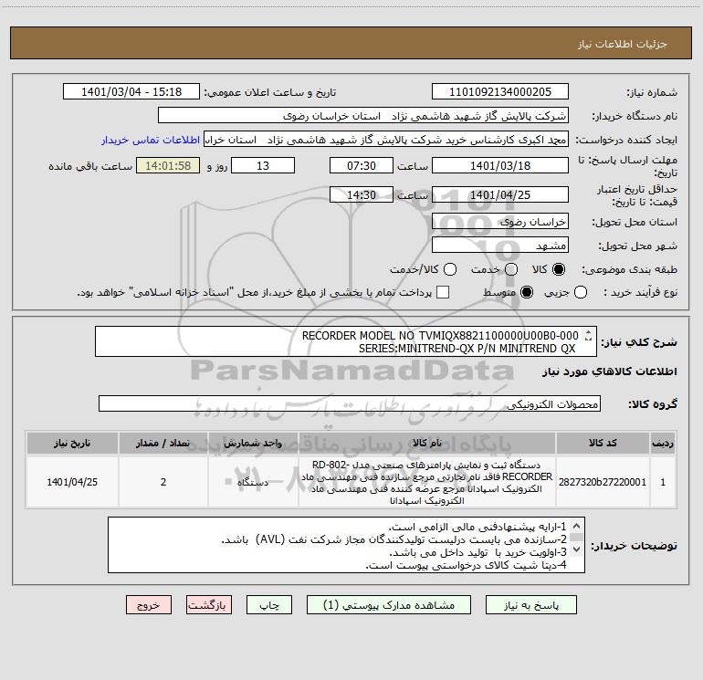 شرح کلی نیاز: RECORDER MODEL NO TVMIQX8821100000U00B0-000
