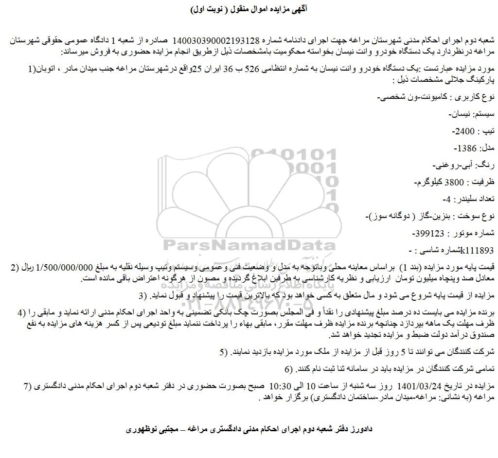 1)مورد مزایده عبارتست :یک دستگاه خودرو وانت نیسان به شماره انتظامی 526 ب 36 ایران 25واقع درشهرستان مراغه جنب میدان مادر ، اتوبان پارکینگ جلالی مشخصات ذیل :
