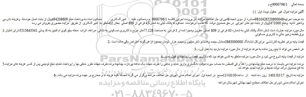 به موجب اجراییه9810426520600048صادره از سوی شعبه 6شورای حل اختلاف مراغه در پرونده اجرایی کلاسه 9900796/1 ج م محکوم علیه امیر آشکاری محکوم است به پرداخت مبلغ 494208609ریال از بابت اصل خواسته وهزینه دادرسی وتاخیر تادیه ومبلغ 2471000ریال از بابت نیم عشر اجرایی در حق صندوق دولت که حسب درخواست محکوم له پلاک ثبتی به شماره43 فرعی از 809 اصلی بخش 02متعلق به امیر آشکاری از طریق مزایده حضوری بفروش می رسد