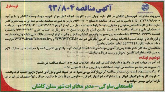شرکت مخابرات استان اصفهان در نظر دارد اجرای طرح تقویت شبکه کابل مرکز شهید مهماندوست کاشان با برآورد 2.398.890.000 و با سپرده شرکت در مناقصه به مبلغ 96.000.000 ریال را به صورت مناقصه یک مرحله ای به پیمانکار واگذار نماید.