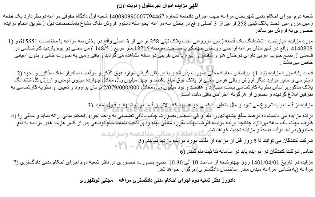 شعبه دوم اجرای احکام مدنی شهرستان مراغه جهت اجرای دادنامه شماره 140030390007794467 شعبه اول دادگاه حقوقی مراغه درنظردارد یک قطعه زمین مزروعی تحت پلاک ثبتی 258 فرعی از 3 اصلی واقع در بخش سه مراغه بخواسته دستور فروش ملک مشاع بامشخصات ذیل ازطریق انجام مزایده حضوری به فروش میرساند: