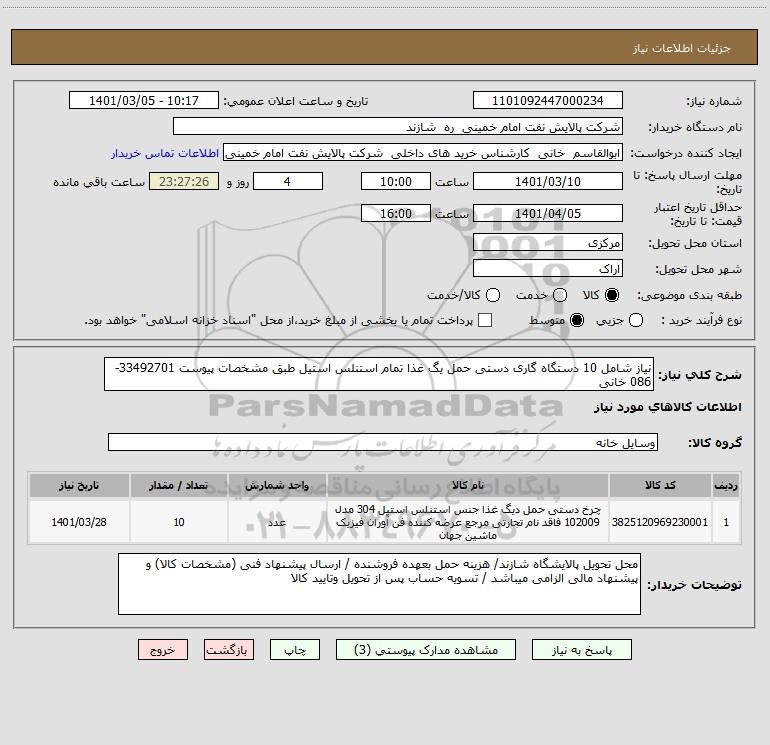 شرح کلی نیاز: نیاز شامل 10 دستگاه گاری دستی حمل یگ غذا تمام استنلس استیل طبق مشخصات پیوست 33492701-086 خانی