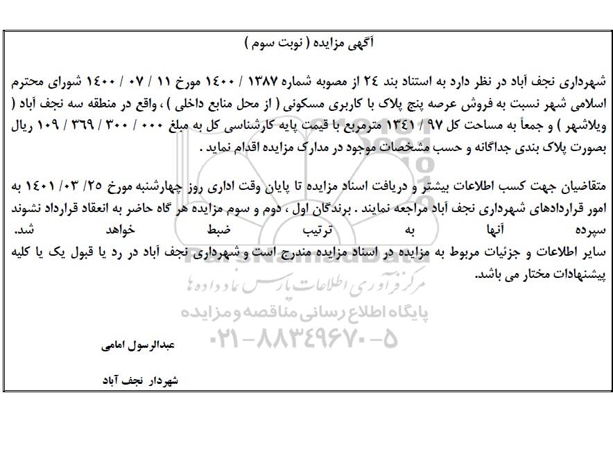 شهرداری نجف اباد در نظر دارد به استناد بند 24 از مصوبه شماره 1400.1387 مورخ 1400.7.11 شورای  محترم اسلامی شهر نسبت به فروش عرصه پنج پلاک مسکونی (از محل منابع داخلی) واقع در منطقه سه نجف آباد (ویلاشهر) و جمعا به مساحت 1341.97 مترمربع  با قیمت پایه کارشناسی کل به مبلغ 109.369.300.000 ریال به صورت پلاک بندی جداگانه و حسب مشخصات موجود در مدارک مزایده اقدام نماید.