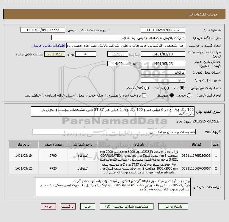 شرح کلی نیاز: 100 برگ ورق آج دار 6 میلی متر و 150 برگ ورق 2 میلی متر ST-37 طبق مشخصات پیوست و تحویل در پالایشگاه.