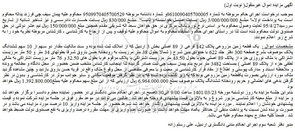 مشخصات اموال : یک قطعه زمین مزروعی پلاک 142 فرعی از 89 اصلی بخش 3 اردبیل که از املاک ثبت شده بوده و سند مالکیت مقدار دو سهم از 10 سهم ششدانگ پلاک موصوف بشرح صفحه 300 دفتر جلد 622 با حدودی بدین شرح ( شمالا بطول 38 متر مرزیست به رودخانه حسن باروق شرقا بطولهای 34 متر و 50 متر مرزیست اشتراکی با ملک نوروزی جزء از پلاک 89 اصلی جنوبا بطول 43.50 متر مرزیست اشتراکی با پلاک مرقوم غربا بطول های 32.50 و 76 متر مرزیست اشتراکی به ملکی لطفی جزء از پلاک 89 اصلی ) بمساحت 3482 متر مربع بنام پیمان سیف چی ثبت صادر گردیده لذا اینجانب کارشناس منتخب ضمن حضور در محل دادگاه و مطالعه پرونده و ملاحظه اسناد و مدارک پیوستی و اطلاع از مفاد قرار کارشناسی در معیت و با معرفی متقاضی از محل وقوع ملک واقع در قریه حسن باروق بازدید و چنین مشاهده گردید ملک مورد ارزیابی بصورت یکقطعه زمین مزروعی بوده که به زیر کشت برده شده که با در نظر گرفتن موقعیت مکانی و سایر جوانب موثر در کارشناسی و بدون در نظر گرفتن بدهی های احتمالی و حریم رودخانه ششدانگ پلاک موصوف بمبلغ 6.964.000.000 ریال ارزیابی که از این مبلغ سهم محکوم علیه بمبلغ1.392.800.000 ریال خواهد بود