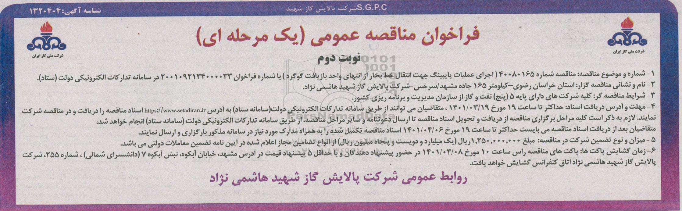 نام و نشانی مناقصه گزار: استان خراسان رضوی کیلومتر ۱۶۵ جاده مشهد سرخس شرکت پالایش گاز شهید هاشمی نژاد