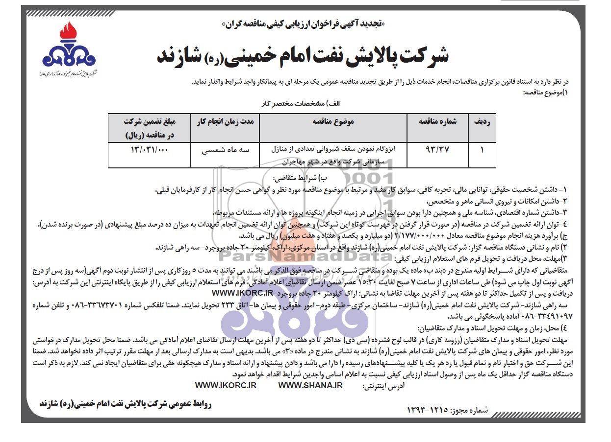 | 93/37 | ایزوگام نمودن سقف شیروانی تعدادی از منازل سازمانی شرکت واقع در شهر مهاجران |