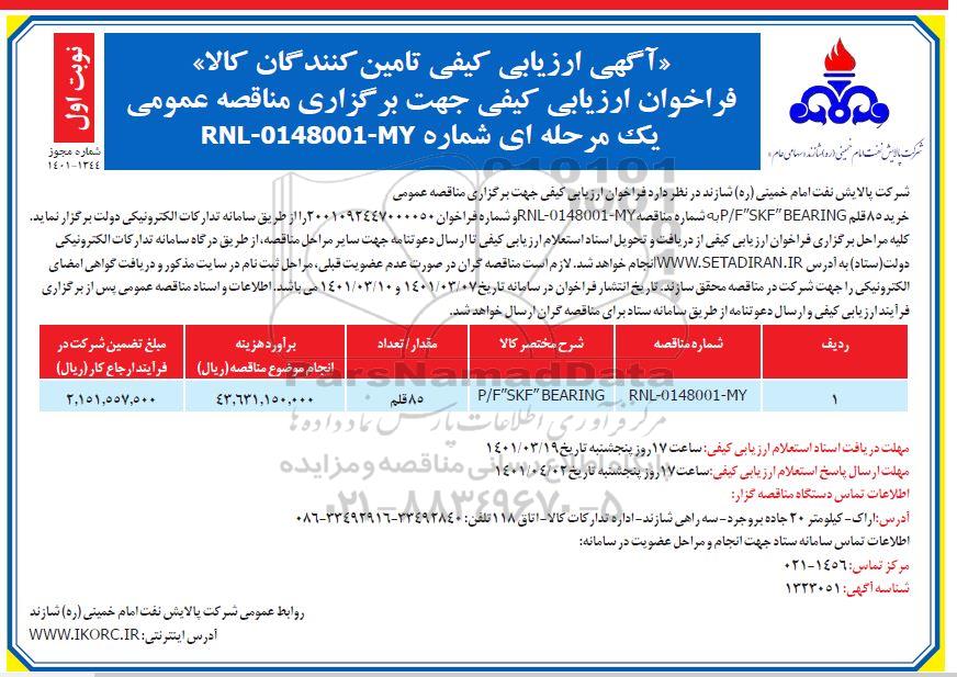 | 1 | RNL- 0148001- MY | P/F SKF BEARING | 85 قلم | 43.631.150.000 | 2.151.557.500 |