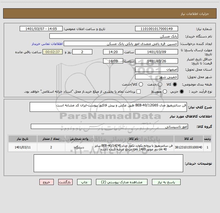 شرح کلی نیاز: فن سانتریفیوژ مدل BEB-40/12G6S طبق عکس و پیش فاکتور پیوست-ایران کد مشابه است