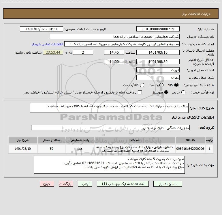 شرح کلی نیاز: جای مایع صابون دیواری 50 عدد- ایران کد انتخاب شده صرفا جهت تشابه با کالای مورد نظر میباشد