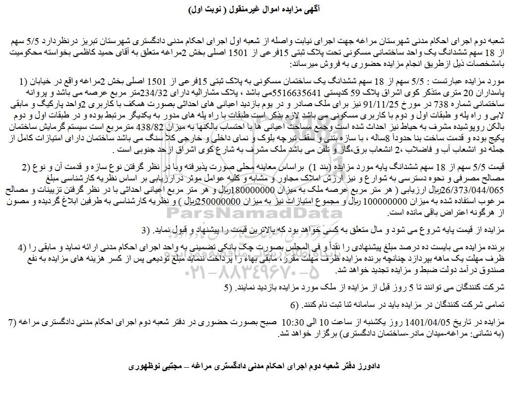 شعبه دوم اجرای احکام مدنی شهرستان مراغه جهت اجرای نیابت واصله از شعبه اول اجرای احکام مدنی دادگستری شهرستان تبریز درنظردارد 5/5 سهم از 18 سهم ششدانگ یک واحد ساختمانی مسکونی تحت پلاک ثبتی 15فرعی از 1501 اصلی بخش 2مراغه متعلق به آقای حمید کاظمی بخواسته محکومیت بامشخصات ذیل ازطریق انجام مزایده حضوری به فروش میرساند: