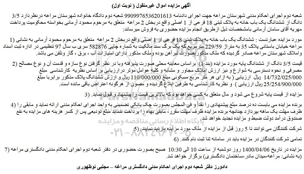 شعبه دوم اجرای احکام مدنی شهرستان مراغه جهت اجرای دادنامه 9909976536201613 شعبه دوم دادگاه خانواده شهرستان مراغه درنظردارد 3/5 دانگ از ششدانگ یک باب خانه به پلاک ثبتی 18 فرعی از 1 اصلی واقع دربخش 2 مراغه  متعلق به مرحوم محمود آرمانی بخواسته محکومیت پرداخت مهریه آقای سامان آرمانی بامشخصات ذیل ازطریق انجام مزایده حضوری به فروش میرساند: