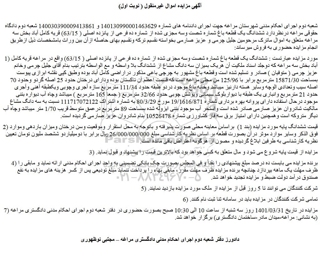 شعبه دوم اجرای احکام مدنی شهرستان مراغه جهت اجرای دادنامه های شماره 140130990001463629 و 140030390009413861 شعبه دوم دادگاه حقوقی مراغه درنظردارد ششدانگ یک قطعه باغ شماره شصت وسه مجزی شده از شماره ده فرعی از پانزده اصلی ( 63/15) قریه کامل آباد بخش سه مراغه متعلق به اموال ماترک مرحومین جلیل چرمی و عزیز صارمی بخواسته نقسیم ترکه وتقسیم بهای حاصله ازآن بین وراث بامشخصات ذیل ازطریق انجام مزایده حضوری به فروش میرساند: