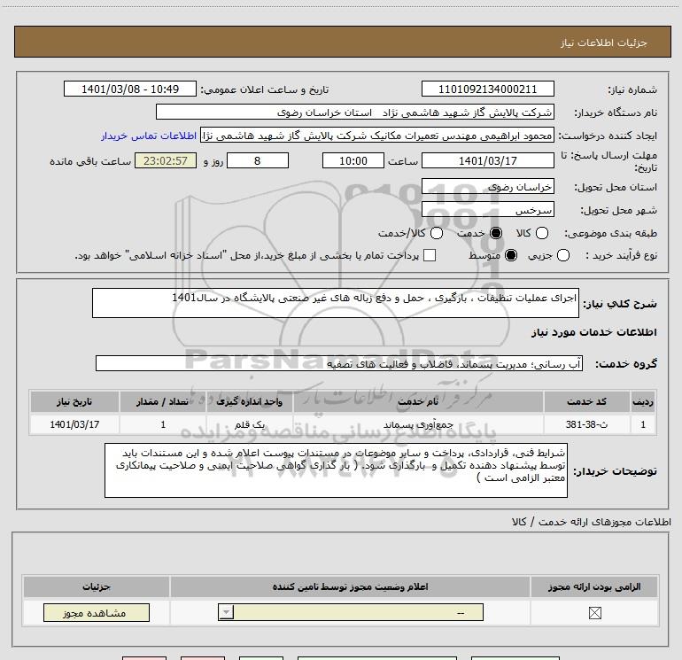 شرح کلی نیاز: اجرای عملیات تنظیفات ، بارگیری ، حمل و دفع زباله های غیر صنعتی پالایشگاه در سال1401