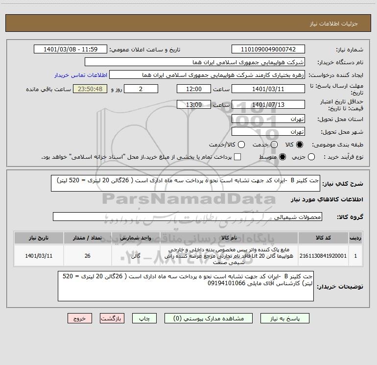 شرح کلی نیاز: جت کلینر B -ایران کد جهت تشابه است نحو ه پرداخت سه ماه اداری است ( 26گالن 20 لیتری = 520 لیتر)