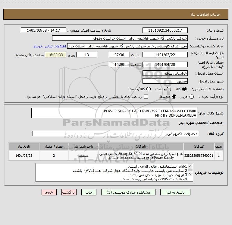 نام دستگاه خریدار:شرکت پالایش گاز شهید هاشمی نژاد استان خراسان رضوی