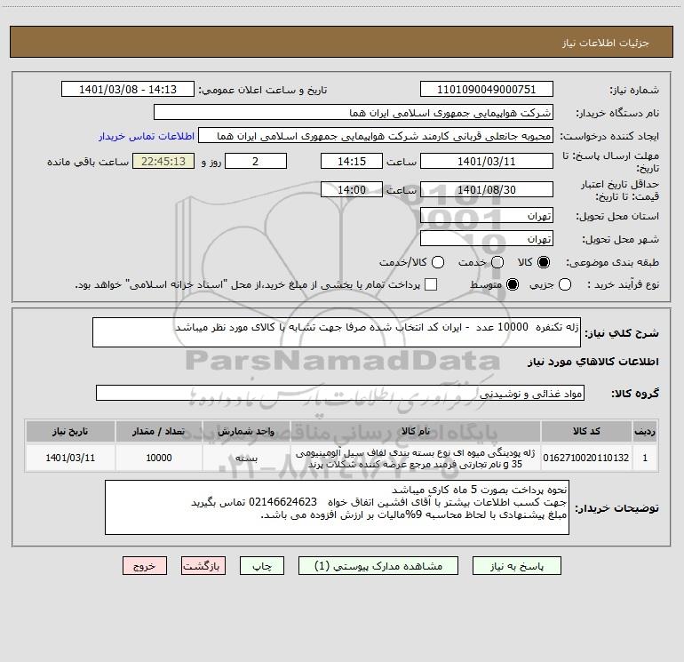 شرح کلی نیاز: ژله تکنفره 10000 عدد - ایران کد انتخاب شده صرفا جهت تشابه با کالای مورد نظر میباشد