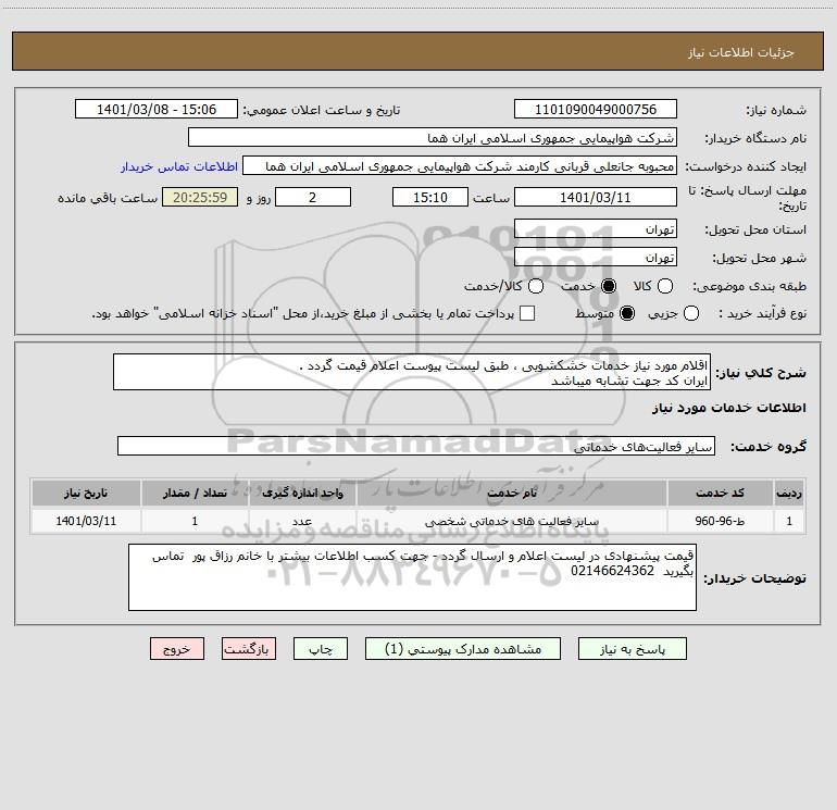 استعلام اقلام مورد نیاز خدمات خشکشویی ، طبق لیست پیوست اعلام قیمت گردد . ایران کد جهت تشابه میباشد ؟