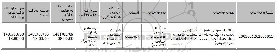| 2001001262000015 | مناقصه عمومی همزمان با ارزیابی (فشرده) یک مرحله ای عملیات خاکی و دیوار حصار آجری پست 400/132 کیلوولت نصر (شوش) | مناقصه عمومی همزمان با ارزیابی (فشرده) | خوزستان | شرکت سهامی برق منطقه ای خوزستان | توسعه و پایداری پستها و شبکه برق استان | 1401/03/09 08:00:00 | 1401/03/16 18:00:00 | 1401/03/30 18:00:00 |