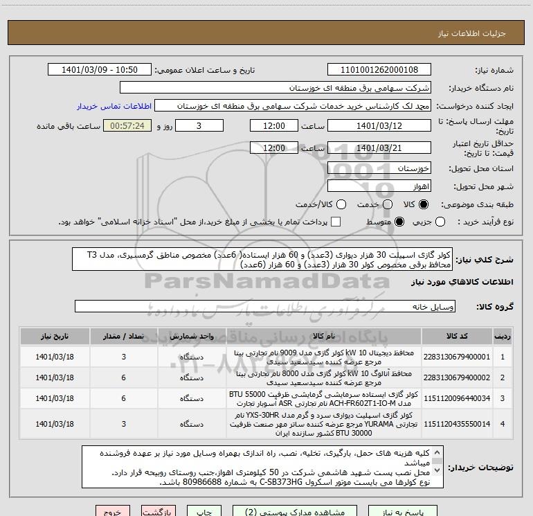 شرح کلی نیاز: کولر گازی اسپیلت 30 هزار دیواری (3عدد) و 60 هزار ایستاده( 6عدد) مخصوص مناطق گرمسیری، مدل T3