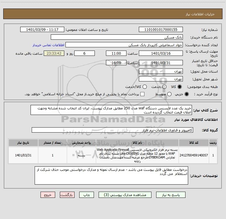 شرح کلی نیاز: خرید یک عدد لایسنس دستگاه waf مدل 250 مطابق مدارک پیوست، ایران کد انتخاب شده مشابه وجهت اعلان قیمت انتخاب گردیده است