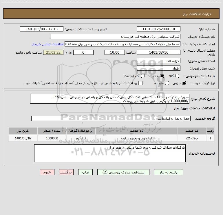 استعلام سورت, تفکیک و بسته بندی آهن آلات دکل بصورت دکل به دکل و باندلی در انبار تی . اس. 46 - /1,000,000کیلوگرم , طبق شرایط کار پیوست, استعلام سورت, تفکیک و بسته بندی آهن آلات دکل بصورت دکل به دکل و باندلی در انبار تی . اس. 46 - /1,000,000کیلوگرم , طبق شرایط کار پیوست