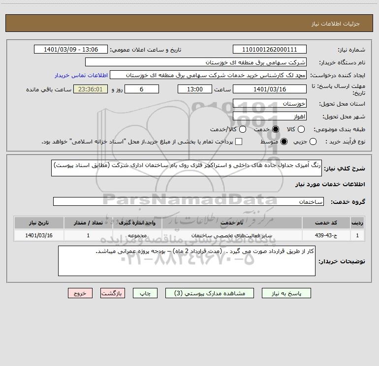 شرح کلی نیاز: رنگ آمیزی جداول جاده های داخلی و استراکچر فلزی روی بام ساختمان اداری شرکت (مطابق اسناد پیوست)