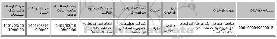 | 2001090049000015 | مناقصه عمومی یک مرحله ای انجام امور مربوط به خدمات اداری - ستادی "هما" | مناقصه عمومی | تهران | شرکت هواپیمایی جمهوری اسلامی ایران هما | انجام امور مربوط به خدمات اداری - ستادی "هما" | 1401/03/10 08:00:00 | 1401/03/16 19:00:00 | 1401/03/26 19:00:00 |