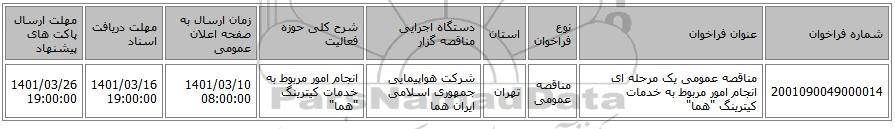 | 2001090049000014 | مناقصه عمومی یک مرحله ای انجام امور مربوط به خدمات کیترینگ "هما" | مناقصه عمومی | تهران | شرکت هواپیمایی جمهوری اسلامی ایران هما | انجام امور مربوط به خدمات کیترینگ "هما" | 1401/03/10 08:00:00 | 1401/03/16 19:00:00 | 1401/03/26 19:00:00 |