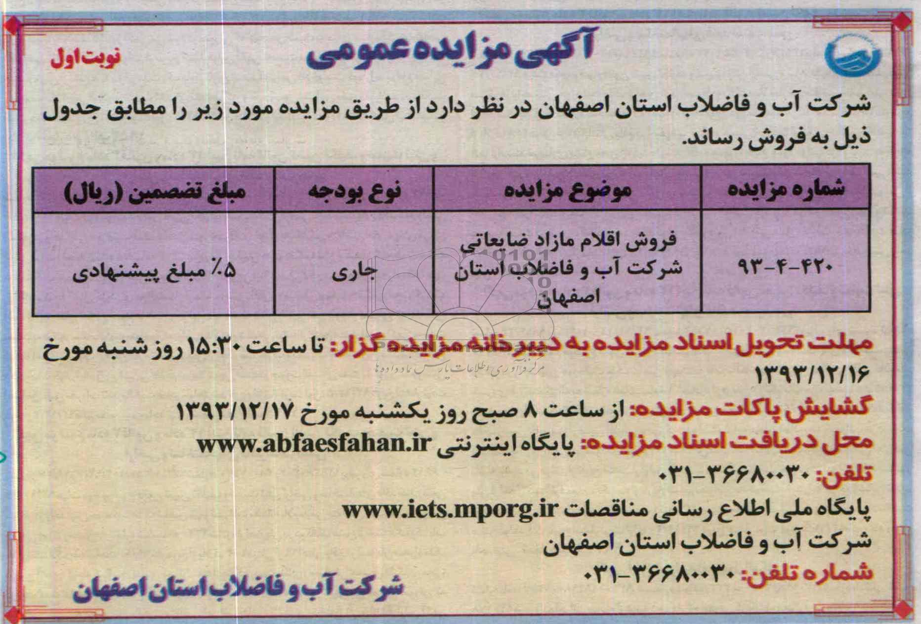 موضوع مزایده فروش اقلام مازاد ضایعاتی شرکت آب و فاضلاب استان اصفهان