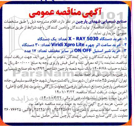صنایع شیمیایی شهدای پارچین در نظر دارد اقلام مشروحه ذیل را طبق مشخصات مندرج در اسناد مناقصه از تولیدکنندگان و تامین کنندگان واجد شرایط از طریق مناقصه عمومی خریداری نماید.