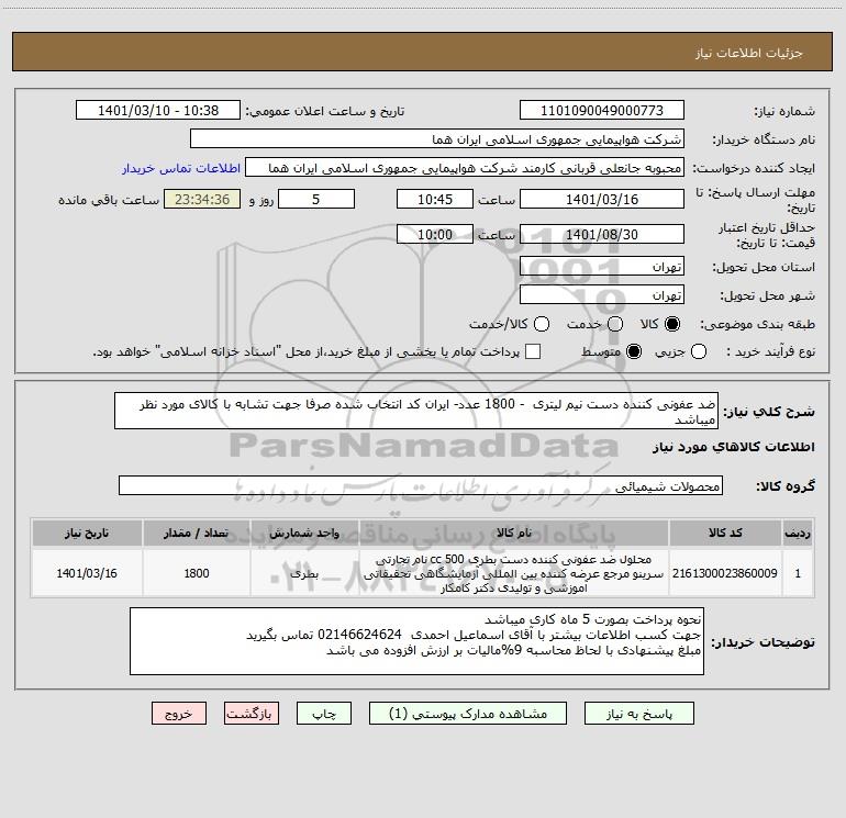 شرح کلی نیاز: ضد عفونی کننده دست نیم لیتری - 1800 عدد- ایران کد انتخاب شده صرفا جهت تشابه با کالای مورد نظر میباشد