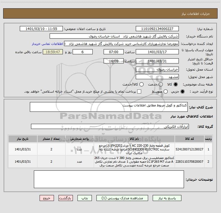 نام دستگاه خریدار:شرکت پالایش گاز شهید هاشمی نژاد استان خراسان رضوی