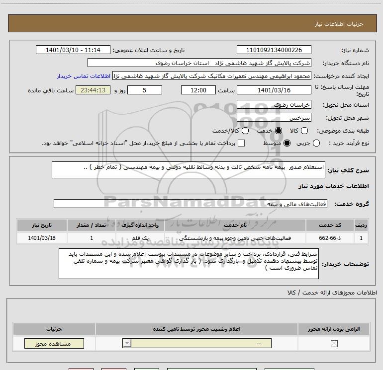 نام دستگاه خریدار:شرکت پالایش گاز شهید هاشمی نژاد استان خراسان رضوی