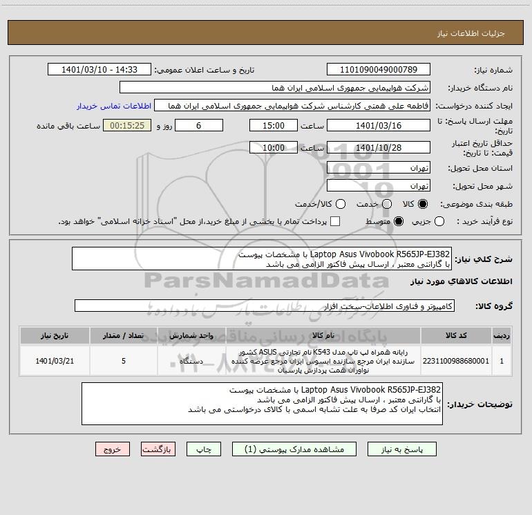 شرح کلی نیاز: Laptop Asus Vivobook R565JP-EJ382 با مشخصات پیوست با گارانتی معتبر ، ارسال پیش فاکتور الزامی می باشد