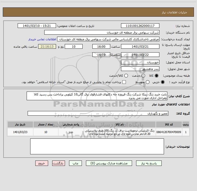 استعلام بابت خرید زنگ زینکا شرکت رنگ فیروزه جه دکلهای فشارقوی برق گالن10 کیلویی پراداخت پس رسید کالا ومراحل اداری صورت می پذیرد, استعلام بابت خرید زنگ زینکا شرکت رنگ فیروزه جه دکلهای فشارقوی برق گالن10 کیلویی پراداخت پس رسید کالا ومراحل اداری صورت می پذیرد