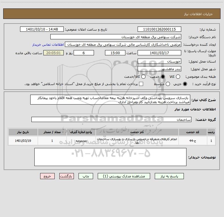 شرح کلی نیاز: بازسازی سرویس بهداشتی وکف آشپزخانه هزینه بیمه مفاصاحساب تهیه ونصب همه اقلام باخود پیمانکار میباشد پرداخت هزینه بعدازتایید کار ومراحل اداری