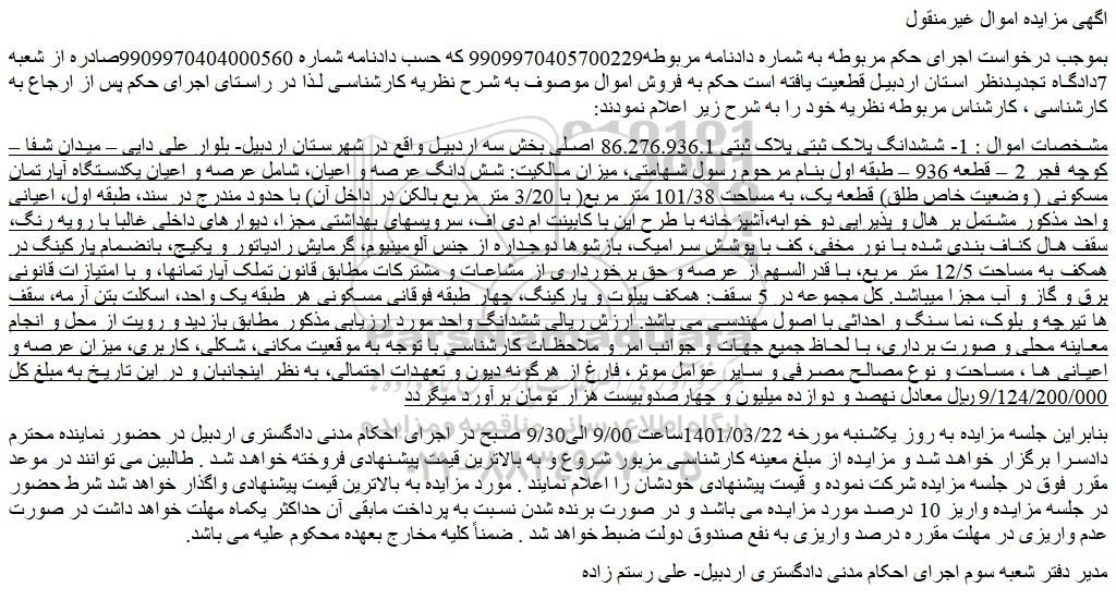 مشخصات اموال : 1- ششدانگ پلاک ثبتی پلاک ثبتی 86.276.936.1 اصلی بخش سه اردبیل واقع در شهرستان اردبیل- بلوار علی دایی – میدان شفا – کوچه فجر 2 – قطعه 936 – طبقه اول بنام مرحوم رسول شهامتی، میزان مالکیت: شش دانگ عرصه و اعیان، شامل عرصه و اعیان یکدستگاه آپارتمان مسکونی ( وضعیت خاص طلق) قطعه یک، به مساحت 101/38 متر مربع( با 3/20 متر مربع بالکن در داخل آن) با حدود مندرج در سند، طبقه اول، اعیانی واحد مذکور مشتمل بر هال و پذیرایی دو خوابه،آشپزخانه با طرح اپن با کابینت ام دی اف، سرویسهای بهداشتی مجزا، دیوارهای داخلی غالبا با رویه رنگ، سقف هال کناف بندی شده با نور مخفی، کف با پوشش سرامیک، بازشوها دوجداره از جنس آلومینیوم، گرمایش رادیاتور و پکیج، بانضمام پارکینگ در همکف به مساحت 12/5 متر مربع، با قدرالسهم از عرصه و حق برخورداری از مشاعات و مشترکات مطابق قانون تملک آپارتمانها، و با امتیازات قانونی برق و گاز و آب مجزا میباشد. کل مجموعه در 5 سقف: همکف پیلوت و پارکینگ، چهار طبقه فوقانی مسکونی هر طبقه یک واحد، اسکلت بتن آرمه، سقف ها تیرچه و بلوک، نما سنگ و احداثی با اصول مهندسی می باشد. ارزش ریالی ششدانگ واحد مورد ارزیابی مذکور مطابق بازدید و رویت از محل و انجام معاینه محلی و صورت برداری، با لحاظ جمیع جهات و جوانب امر و ملاحظات کارشناسی با توجه به موقعیت مکانی، شکلی، کاربری، میزان عرصه و اعیانی ها ، مساحت و نوع مصالح مصرفی و سایر عوامل موثر، فارغ از هرگونه دیون و تعهدات احتمالی، به نظر اینجانبان و در این تاریخ به مبلغ کل 9/124/200/000 ریال معادل نهصد و دوازده میلیون و چهارصدوبیست هزار تومان برآورد میگردد