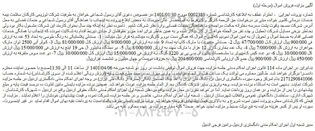 شماره پرونده اجرایی: - احترام عطف به ابلاغیه کارشناسی شماره 0002380 مورخ 1401/01/30 در خصوص دعوی آقای رسول شجاعی خواهان به طرفیت شرکت توزیعی کارکنان سلامت بیمه خدمات درمانی کشور خوانده مبنی بر درخواست حق الزحمه کارگر و کارفرما به استحضار عالی میرساند به محض ابلاغ پرونده به اینجانب با هماهنگی آقای رسول شجاعی و خدمات قضایی به محل آدرس شرکت مسجد یاقوت پشت مدرسه دخترانه حکمت مراجعه و با هماهنگی خدمات قضایی وارد دفتر شرکت شدیم . نامبرده نظر به اینکه چند سال بعنوان کارمند این شرکت مشغول بکار بود ولی بخاطر برخی مسایل شرکت تعطیل و چند نفر من الجمله خواهان از کار بیکار شده و به همین خاطر برای اخذ حق و حقوقشان از مبادی ذیربط اقدام به شکایت نمودند که اینجانب با همانگی خدمات قضایی اقدام به ضبط اموال و تحویل آن به امین اموال نمودیم که شرح اموال که همگی دست دوم و کارکرده میباشد به قرار ذیل میباشد : 1- صندلی پلاستیکی به رنگ طوسی به تعداد 53 عدد به ارزش فی 900/000 ریال ارزش کل 47/700/000 ریال 2- صندلی مدیریت با مارک کاپ به تعداد 9 عدد به ارزش فی 9/000/000 ریال ارزش کل 81/000/000 ریال 3- کولر آبی 2500 توان مارک جواهران به ارزش کل 7/000/000 ریال 4- یک عدد بخاری گازی 12 هزار با مارک سهند به ارزش 8/000/000 ریال 5- دو دستگاه مانیتور ال جی 19 اینج به ارزش فی 15/000/000 ریال ارزش کل 30/000/000 ریال 6- دو عدد کیس کامپیوتر با مشخصات پنتیوم آر سی پی یو 3220 گیگ به ارزش فی 15/000/000 ریال ارزش کل 30/000/000 ریال 7- دو عدد موس متفرقه به ارزش 450/000 ریال ارزش کل 900/000 ریال جمع کل ارزیابی کارشناسی 204/600/000 ریال به حروف دویست و چهار میلیون و ششصد هزارریال