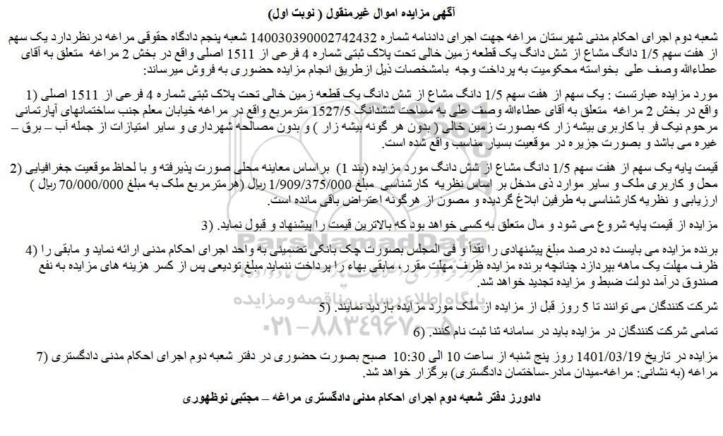 مزایده فروش یک سهم از هفت سهم 1/5 دانگ مشاع از شش دانگ یک قطعه زمین خالی تحت پلاک ثبتی شماره 4 فرعی از 1511 اصلی , مزایده فروش یک سهم از هفت سهم 1/5 دانگ مشاع از شش دانگ یک قطعه زمین خالی تحت پلاک ثبتی شماره 4 فرعی از 1511 اصلی