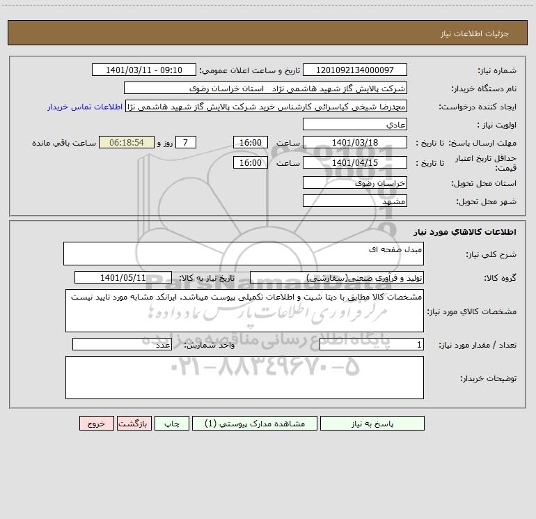 نام دستگاه خریدار:شرکت پالایش گاز شهید هاشمی نژاد استان خراسان رضوی