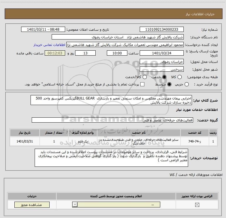 نام دستگاه خریدار:شرکت پالایش گاز شهید هاشمی نژاد استان خراسان رضوی